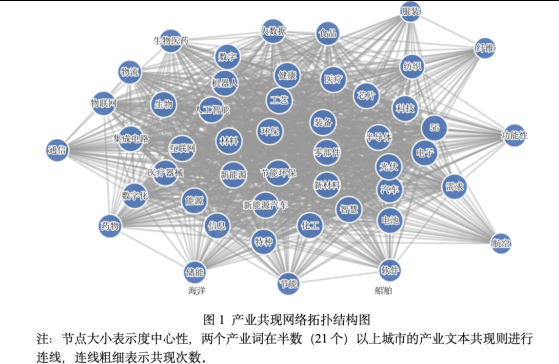 如果说热门词反映了41个城市产业政策的聚焦点,那么产业共词网络则揭示出产业间的结构关联。本文根据热门词分析,选取前50个能代表产业的词汇,构建无向加权网络,以剖析区域产业布局的拓扑形态(如图1)。