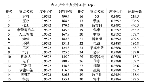 进一步对产业共词网络中的产业节点进行度中心性分析,以便观测到成为关键节点的重点产业。于是,本文对Top30产业节点的度中心性进行计算(如表2)。